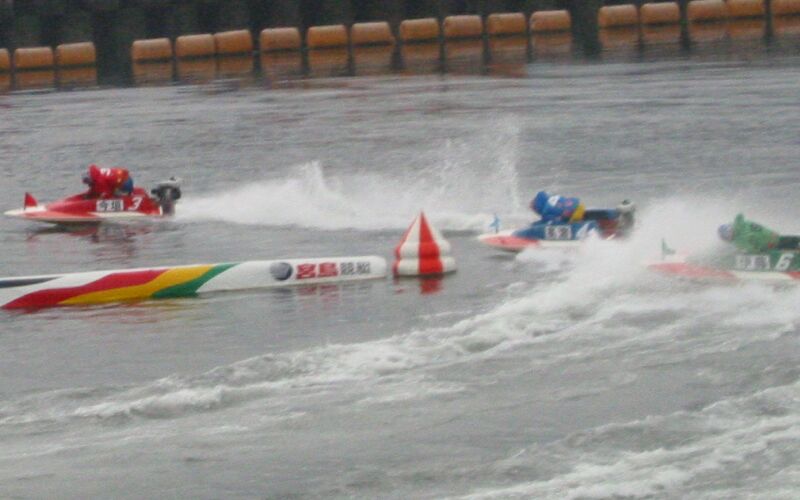 ![]() | トップの今垣は独走態勢でトップは確定。その後ろでは残った3艇が熾烈な2着争いを演じる。2周1Mでは内から先マイをする高濱に内から伊藤が差し・外から濱野谷がツケマイで襲いかかる! |